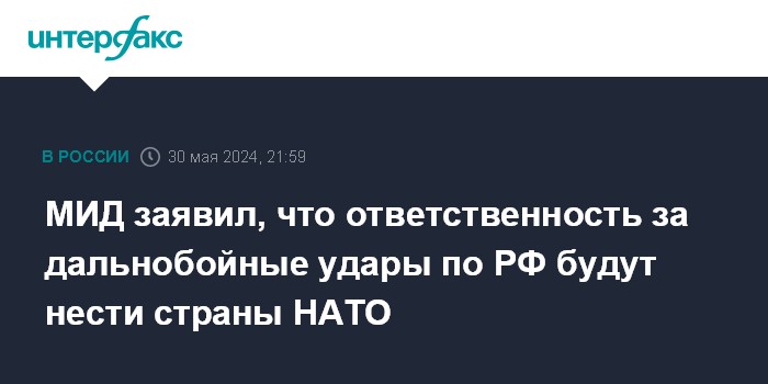 Москва. 30 мая. INTERFAX.RU - В Москве считают выдуманной дискуссию на Западе по поводу выдачи разрешения Киеву наносить удары западными дальнобойными вооружениями по российской территории, ответственность за них будут нести страны НАТО, заявила официальный представитель МИД РФ Мария Захарова.