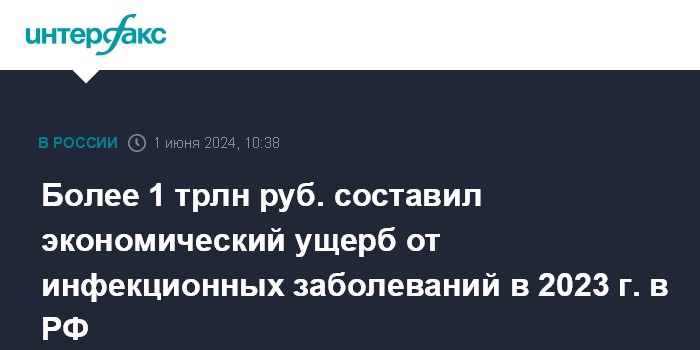 Москва. 1 июня. INTERFAX.RU - Экономический ущерб от 34 инфекционных заболеваний в России за 2023 год составил более 1 трлн рублей, следует из доклада Роспотребнадзора "О состоянии санитарно-эпидемиологического благополучия населения в РФ в 2023 году".