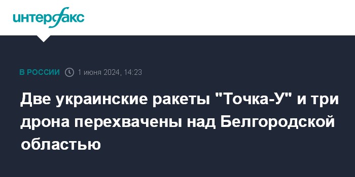 Москва. 1 июня. INTERFAX.RU - Министерство обороны РФ сообщило, что в субботу с 10:00 до 12:00 над Белгородской областью средствами ПВО уничтожены две украинские ракеты тактического комплекса "Точка-У" и три беспилотника.
