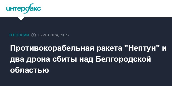 Москва. 1 июня. INTERFAX.RU - Российские силы противовоздушной обороны сбили противокорабельную ракету "Нептун" и два беспилотника самолетного типа над Белгородской областью, заявили в Минобороны РФ.