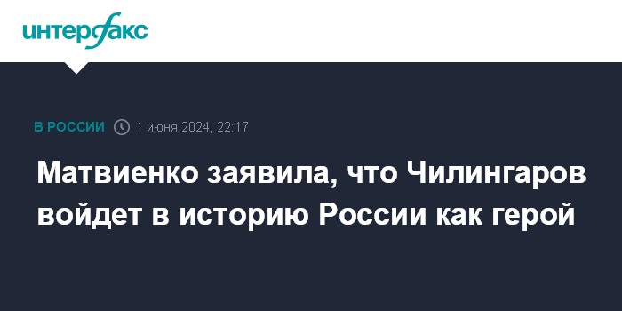 Москва. 1 июня. INTERFAX.RU - Полярный исследователь Артур Чилингаров войдет в историю России как герой, прямой, честный и ответственный человек, заявила спикер Совета Федерации Валентина Матвиенко.