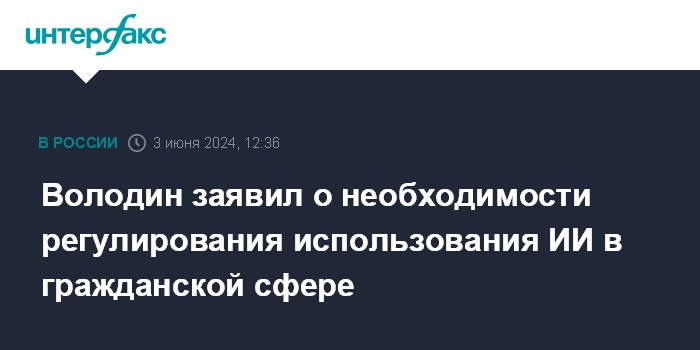 Москва. 3 июня. INTERFAX.RU - Спикер Госдумы Вячеслав Володин на заседании Совета Парламентской ассамблеи ОДКБ заявил о рисках развития технологий искусственного интеллекта и добавил, что необходимо регулировать использование этих технологий в гражданской сфере. Его слова приведены на сайте Думы.
