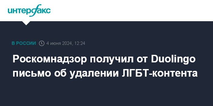 "Компания Duolingo направила в Роскомнадзор ответное письмо, в котором подтвердила, что она удалила из обучающего приложения материалы, пропагандирующие нетрадиционные сексуальные отношения", - сказал сотрудник пресс-службы.