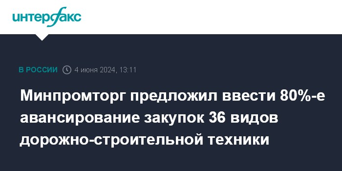 Москва. 4 июня. INTERFAX.RU - Минпромторг предлагает ввести требование об авансировании в размере 80% от начальной (максимальной) цены контракта при госзакупках 36 видов дорожно-строительной техники, следует из проекта правительственного постановления, опубликованного на портале проектов нормативных правовых актов.
