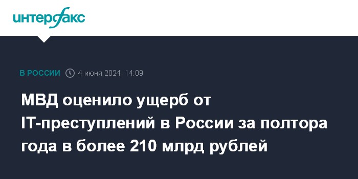 Москва. 4 июня. INTERFAX.RU - Глава МВД Владимир Колокольцев заявил, что ущерб от действий мошенников в сфере информационных технологий за 2023-2024 годы в стране превысил 210 млрд рублей. Он сказал об этом на коллегии ведомства, посвященной борьбе с IT-преступлениями.