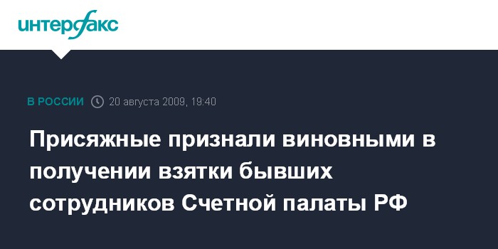 Москва. 20 августа. ИНТЕРФАКС - Коллегия присяжных в Мосгорсуде признала виновными во взяточничестве троих бывших сотрудников Счетной палаты РФ.