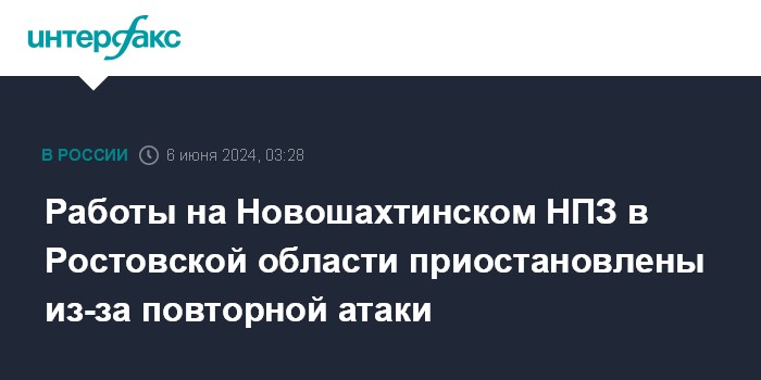 Москва. 6 июня. INTERFAX.RU - Губернатор Ростовской области Василий Голубев сообщил о повторной атаке БПЛА на Новошахтинский нефтеперерабатывающий завод, работы приостановлены.