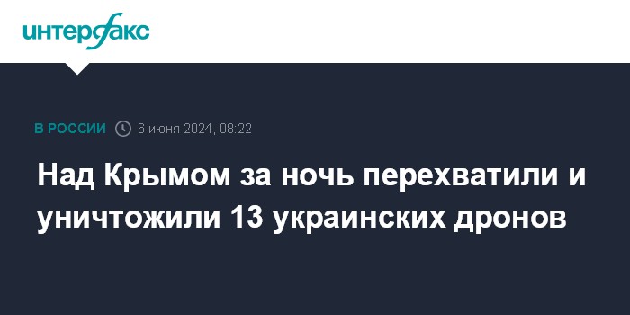 Москва. 6 июня. INTERFAX.RU - Российские силы противовоздушной обороны (ПВО) в течение ночи сбили и перехватили 13 беспилотников над Крымом, а также одну противокорабельную ракету "Нептун" над Ростовской областью, сообщили в Минобороны РФ.