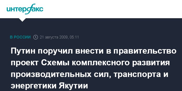 Мирный. 21 августа. ИНТЕРФАКС - Премьер-министр РФ Владимир Путин поручил Минрегиону совместно с властями Республики Якутия доработать и внести в правительство проект Схемы комплексного развития производительных сил, транспорта и энергетики Якутии.