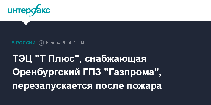 ТЭЦ "Т Плюс", снабжающая Оренбургский ГПЗ "Газпрома", перезапускается после пожара