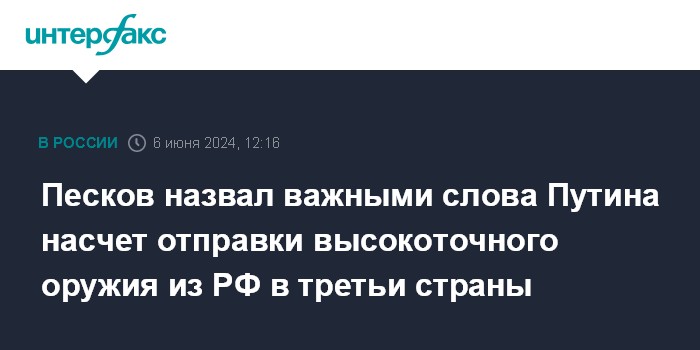 Песков назвал важными слова Путина насчет отправки высокоточного оружия из РФ в третьи страны