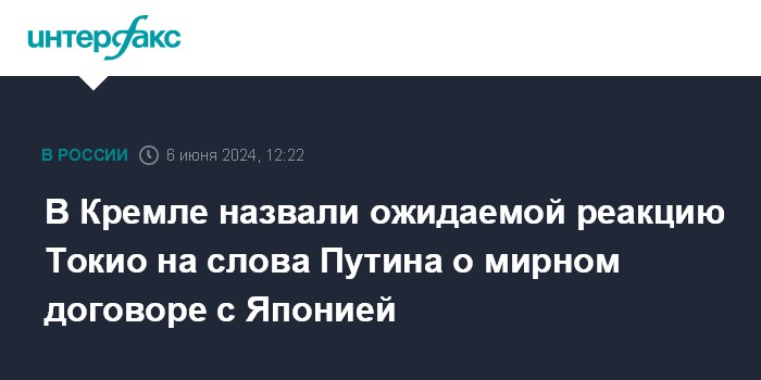 Москва. 6 июня. INTERFAX.RU - Пресс-секретарь президента Дмитрий Песков считает ожидаемой реакцию японского правительства на слова Владимира Путина об отсутствии условий для продолжения диалога по мирному договору с Японией.