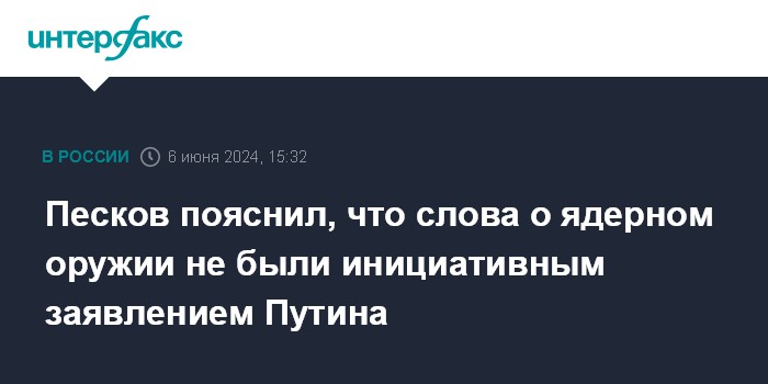 Москва. 6 июня. INTERFAX.RU - Ни одно из СМИ не описало контекст заявления президента РФ Владимира Путина о возможности применения ядерного оружия, сделанного им в среду, заметил пресс-секретарь главы государства Дмитрий Песков.