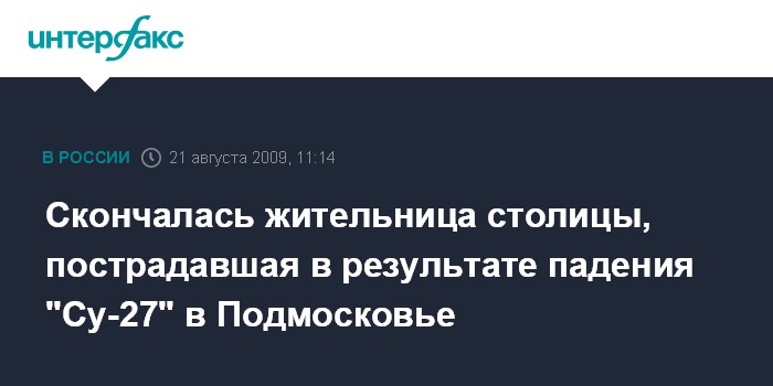 Москва. 21 августа. INTERFAX.RU - Скончалась москвичка, пострадавшая в результате падения на один из дачных домов в Подмосковье истребителя Су-27 во время тренировочных полетов перед открытием авиасалона "МАКС-2009". "Скончалась Ольга Юдина. У нее были ожоги 80% тела. Самолет упал прямо на то место, где они жили с семьей",- сказал "Интерфаксу" в пятницу адвокат Юдиной Игорь Трунов. По ее словам, муж скончавшейся женщины также пострадал в результате падения самолета, но значительно меньше. "Он уже переведен в общую палату",- сказал Трунов.