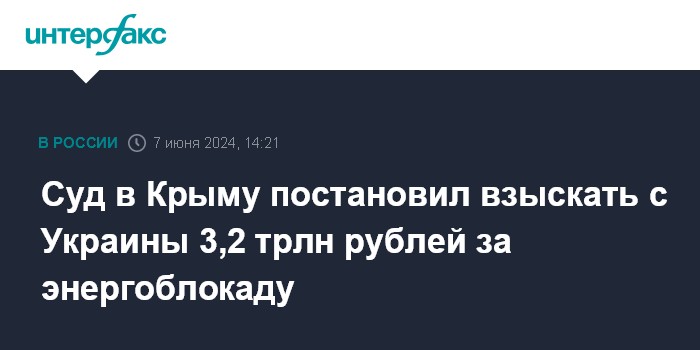 Москва. 7 июня. INTERFAX.RU - Арбитражный суд Крыма удовлетворил исковые требования властей республики к Украине по делу о возмещении ущерба, причиненного в результате энергоблокады полуострова, на общую сумму 3,2 трлн рублей, сообщил председатель Госсовета Крыма Владимир Константинов.
