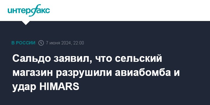 Москва. 7 июня. INTERFAX.RU - Губернатор Херсонской области Владимир Сальдо заявил журналистам, что по сельскому магазину в Садовом, где погибли 19 человек, сначала ударила управляемая авиабомба, а затем РСЗО Himars.