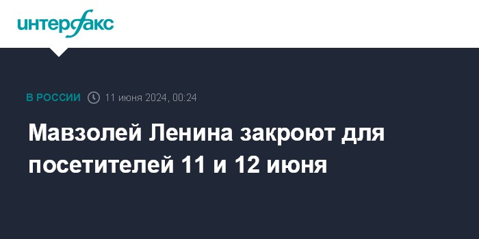 Москва. 11 июня. INTERFAX.RU - Допуск посетителей в Мавзолей Ленина и к Некрополю у Кремлевской стены 11 и 12 июня осуществляться не будет, сообщает центр по связям с прессой и общественностью ФСО РФ.