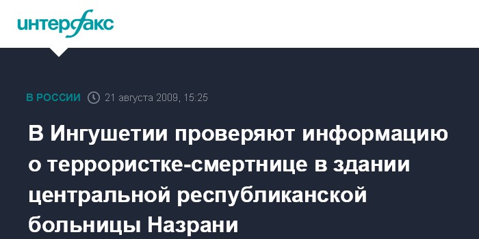 Москва. 21 августа. INTERFAX.RU - Сотрудники МВД Ингушетии в настоящее время проверяют информацию о том, что якобы террористка-смертница со взрывном устройством вошла в здание Центральной республиканской больницы в Назрани.