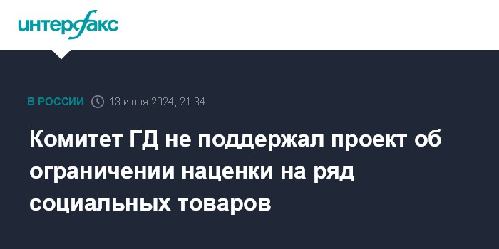 Москва. 13 июня. INTERFAX.RU - Комитет Госдумы по промышленности и торговле рекомендовал нижней палате парламента на заседании 18 июня отклонить законопроект о введении пороговых наценок на социально значимые продовольственные товары в размере 10%; ранее проект закона был поддержан всеми комитетами-соисполнителями.