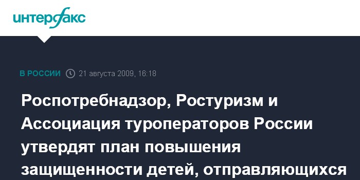 Москва. 21 августа. INTERFAX.RU - Роспотребнадзор рассчитывает до конца августа утвердить с Ростуризмом и Ассоциацией туроператоров России совместный план повышения защищенности детей, выезжающих из РФ отдыхать или учиться за рубеж.