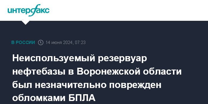 Неиспользуемый резервуар нефтебазы в Воронежской области был незначительно поврежден обломками БПЛА