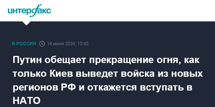 Москва. 14 июня. INTERFAX.RU - Россия готова прекратить боевые действия и начать переговоры, как только Украина объявит о выводе войск из Донецкой и Луганской народных республик, Херсонской и Запорожской областей и об отказе от вступления в НАТО, заявил президент РФ Владимир Путин.