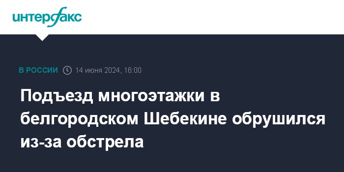 Москва. 14 июня. INTERFAX.RU - Белгородский губернатор Вячеслав Гладков сообщил о трех пострадавших в результате обрушения подъезда многоэтажного жилого дома в городе Шебекино при обстреле ВСУ в пятницу.