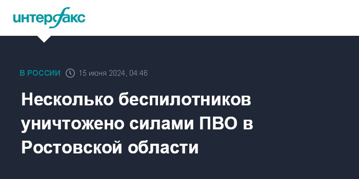 Москва. 15 июня. INTERFAX.RU - Губернатор Ростовской области Василий Голубев сообщил об уничтожении нескольких дронов средствами противовоздушной обороны (ПВО) в ночь на субботу в регионе.