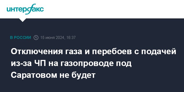 Москва. 15 июня. INTERFAX.RU - Перебоев с подачей и отключения газа для потребителей в связи с аварией на газопроводе под Саратовом не будет, сообщил в субботу губернатор Роман Бусаргин.