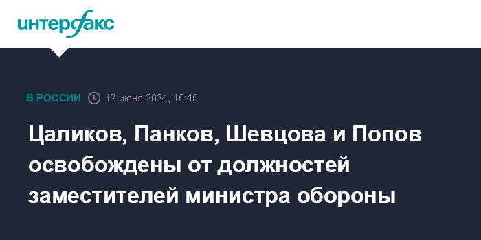 "Освободить от занимаемой должности: Панкова Николая Александровича, статс-секретаря - заместителя министра обороны РФ, Цаликова Руслана Хаджисмеловича, первого заместителя министра обороны РФ, Шевцову Татьяну Викторовну, заместителя министра обороны РФ. Освободить генерала армии Попова Павла Анатольевича от должности заместителя министра обороны РФ и уволить его с военной службы", - говорится в указе, датированном 17 июня 2024 года.