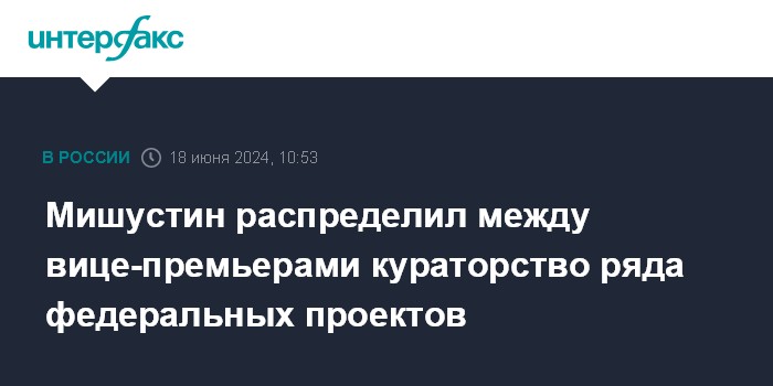 Москва. 18 июня. INTERFAX.RU - Премьер РФ Михаил Мишустин утвердил распределение обязанностей между своими заместителями по кураторству ряда федеральных проектов.