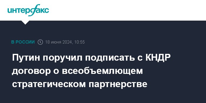 Москва. 18 июня. INTERFAX.RU - Президент РФ Владимир Путин распорядился подписать Договор о всеобъемлющем стратегическом партнерстве между Российской Федерацией и Корейской Народно-Демократической Республикой.