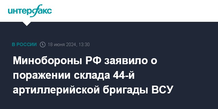 Москва. 18 июня. INTERFAX.RU - Российские военные заявили о поражении склада военно-технического имущества 44-й артиллерийской бригады ВСУ, с которого осуществлялась разгрузка поставленного Западом вооружения.