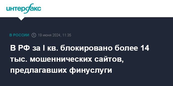 Москва. 19 июня. INTERFAX.RU - Генпрокурор РФ Игорь Краснов сообщил о блокировке в январе-марте более 14 тысяч мошеннических сайтов, предлагающих выдачу кредитов, оформление вкладов и других финансовых продуктов.