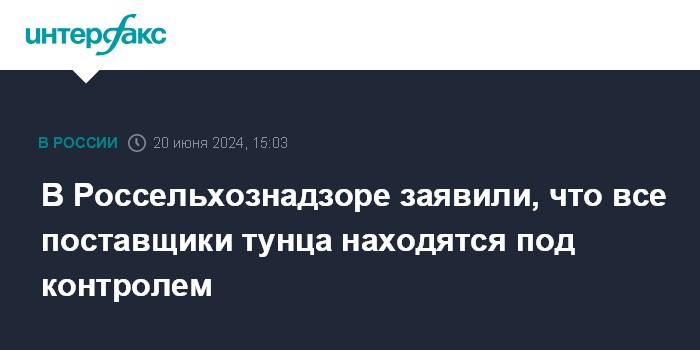 Москва. 20 июня. INTERFAX.RU - Все поставщики тунца в РФ включены в информационную систему Россельхознадзора и находятся под контролем, сообщил "Интерфаксу" руководитель этого ведомства Сергей Данкверт, комментируя ситуацию со вспышкой ботулизма в РФ.
