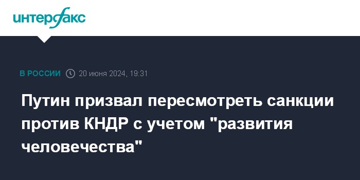 Москва. 20 июня. INTERFAX.RU - Некоторые ограничительные меры в отношении КНДР могут быть пересмотрены с учетом современного уровня развития человечества, считает президент РФ Владимир Путин.