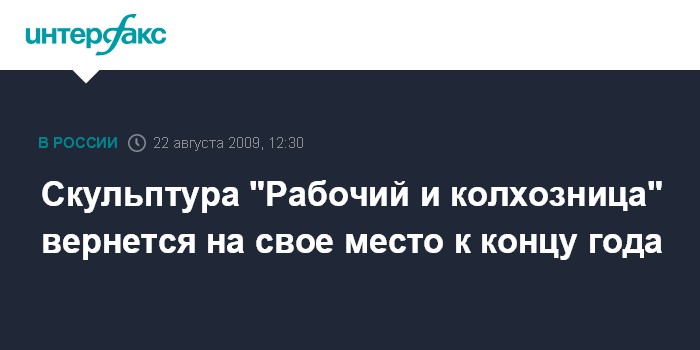 Москва. 22 августа. INTERFAX.RU - Скульптура "Рабочий и колхозница" Веры Мухиной после реставрации будет возвращена на свое прежнее место при входе в ВВЦ к концу этого года, сообщил и.о. мэра Москвы Владимир Ресин в субботу во время объезда стройплощадок.