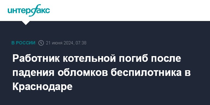 Москва. 21 июня. INTERFAX.RU - Губернатор Краснодарского края Вениамин Кондратьев сообщил о гибели сотрудника поврежденной котельной в Краснодаре после падения БПЛА.