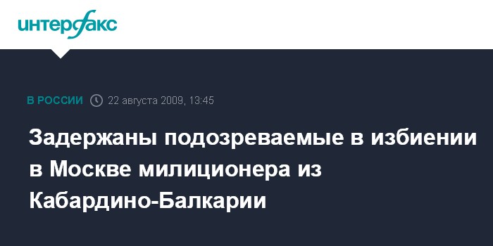 Москва. 22 августа. INTERFAX.RU - В столице задержаны подозреваемые в избиении полковника милиции, сотрудника МВД Кабардино-Балкарии, сообщил "Интерфаксу" дежурный офицер Управления информации и общественных связей ГУВД Москвы Анатолий Ластовецкий.