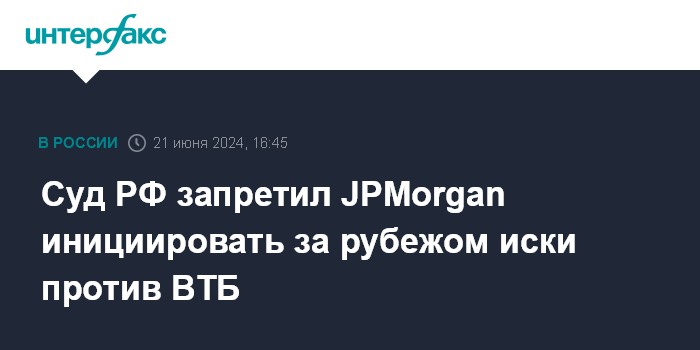 Москва. 21 июня. INTERFAX.RU - Арбитражный суд Санкт-Петербурга и Ленинградской области запретил американскому JPMorgan Chase & Co. инициировать и продолжать за пределами РФ разбирательства против ВТБ, связанные с причинением вреда российскому госбанку в результате блокировки денежных средств, свидетельствует информация в картотеке арбитражных дел.