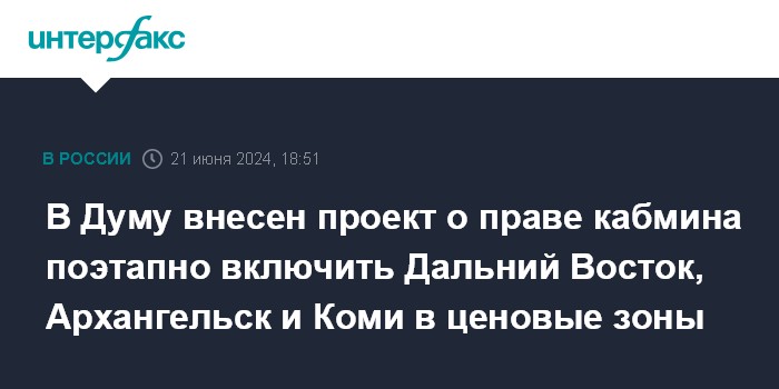 В Думу внесен проект о праве кабмина поэтапно включить Дальний Восток, Архангельск и Коми в ценовые зоны