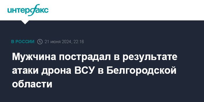 Москва. 21 июня. INTERFAX.RU - Губернатор Белгородской области Вячеслав Гладков сообщил об атаке со стороны вооруженных сил Украины (ВСУ) на Шебекинский городской округ, в результате которой пострадал мужчина.