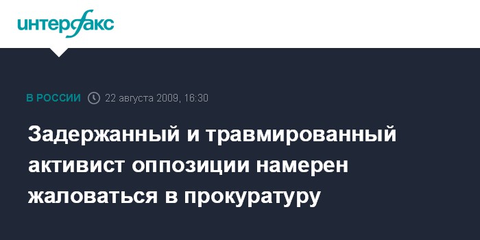 Москва. 22 августа. INTERFAX.RU - Активист оппозиционного движения "Солидарность" Илья Яшин обратился в милицию в связи с причинением ему телесных повреждений при задержании правоохранительными органами на акции оппозиции в Москве в субботу. Он уже написал заявление в милицию и намерен далее обратиться в прокуратуру. Яшин сообщил, что находится вбольнице, где ему наложили швы на рану головы.