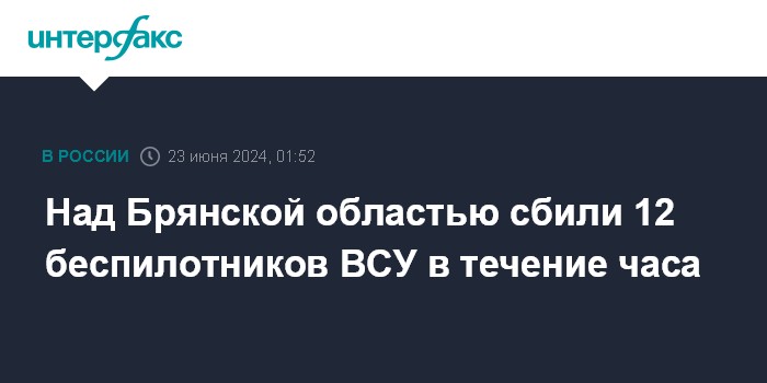Москва. 23 июня. INTERFAX.RU - Губернатор Брянской области Александр Богомаз сообщил об уничтожении в ночь на воскресенье 12 украинских дронов над Трубчевским, Брасовским и Почепским районами.