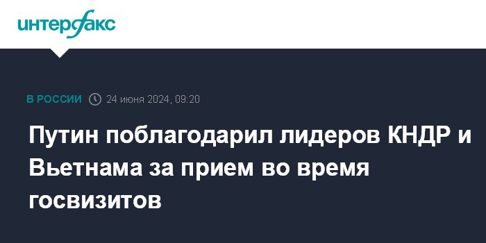Москва. 24 июня. INTERFAX.RU - Президент России Владимир Путин выразил признательность председателю государственных дел КНДР Ким Чен Ыну и генеральному секретарю Центрального комитета Коммунистической партии Вьетнама То Ламу, президенту Вьетнама Нгуен Фу Чонгу за замечательный приём и сердечное гостеприимство, оказанные делегации РФ в ходе пребывания в этих республиках.