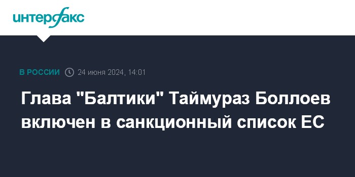 Москва. 24 июня. INTERFAX.RU - Президент пивоваренной компании "Балтика" Таймураз Боллоев включен в санкционный список ЕС, сообщается в официальном журнале ЕС.