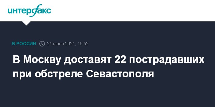 Москва. 24 июня. INTERFAX.RU - Спецборт МЧС РФ с 22 пострадавшими при обстреле Севастополя вылетел в Москву, сообщает в понедельник министерство.