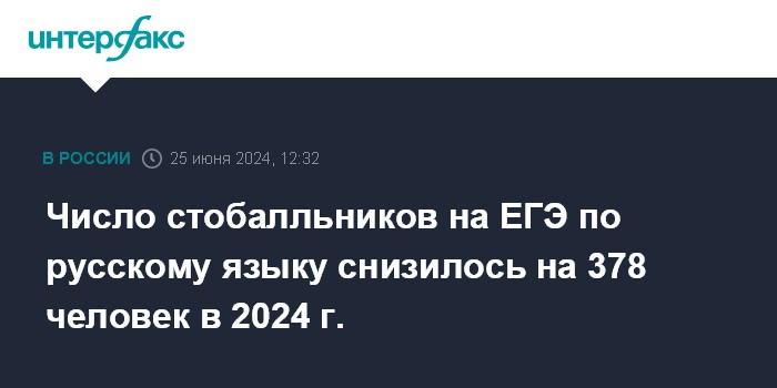 Москва. 25 июня. INTERFAX.RU - Количество человек, сдавших Единый госэкзамен (ЕГЭ) по русскому языку на 100 баллов снизилось в 2024 году на 378 человек, сообщили в Рособрнадзоре.