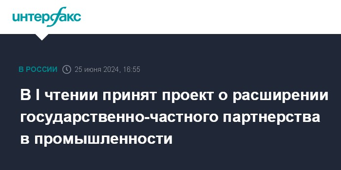 Москва. 25 июня. INTERFAX.RU - Госдума приняла в первом чтении законопроект, который расширяет возможность применения механизмов государственно-частного партнерства (ГЧП) в сфере промышленности, в случае если речь идет о проектах в сфере технологического суверенитета.