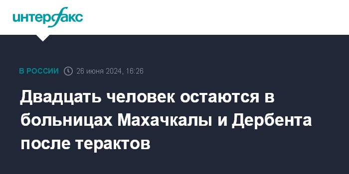 Москва. 26 июня. INTERFAX.RU - Два десятка человек продолжают лечение в стационарах Дагестана после терактов в Махачкале и Дербенте, сообщили в среду "Интерфаксу" в экстренных службах республики.